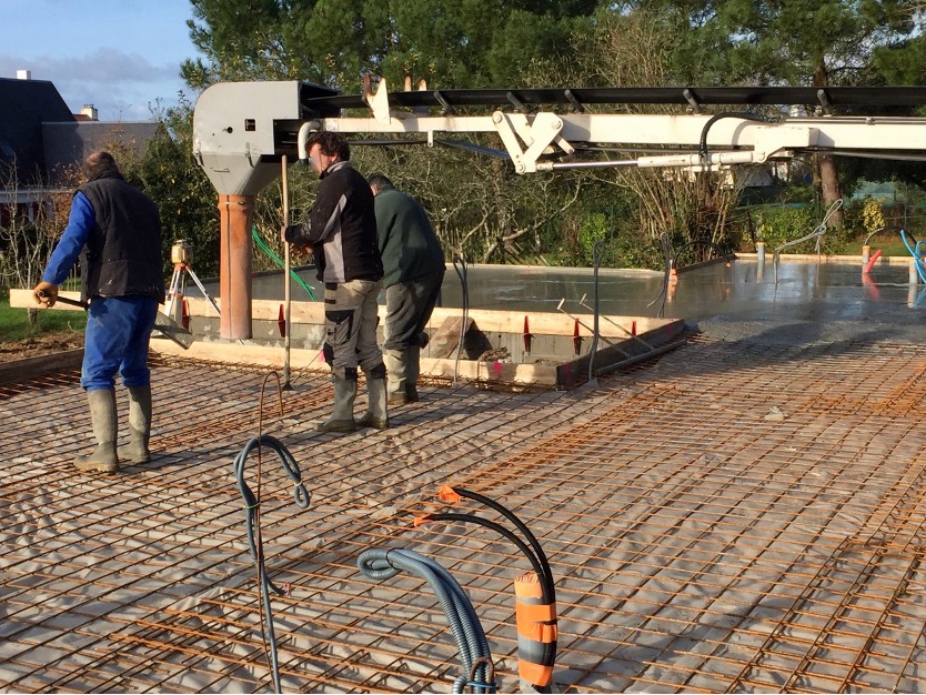 Ils font ensuite intervenir les lots techniques (électricien, plombier, chauffagiste) pour l’incorporation de leurs réseaux respectifs dans le terre-plein avant la mise en place de la coupure anti termites, du treillis métallique et des aciers prévus pour le chainage de la future dalle béton. La pose d’un coffrage en périphérie finalise la préparation avant le coulage.