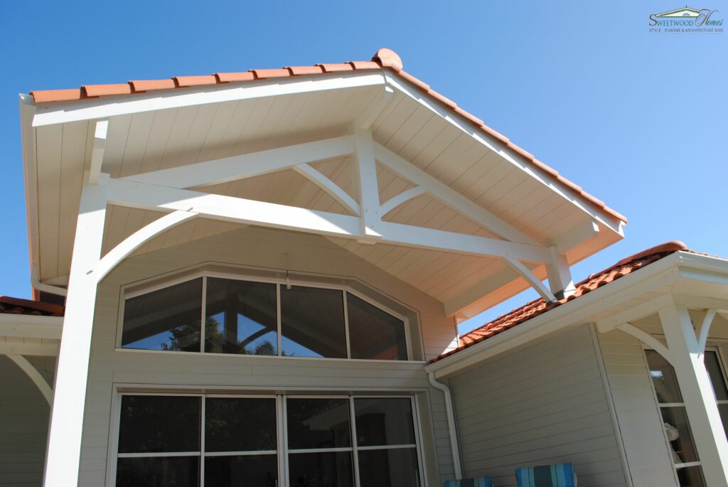 Dès les premiers rayons de soleils, l’ouverture des baies, agrandissent considérablement le volume de l’espace de vie familiale. Le service se trouve facilité par la proximité de la cuisine et sans décalage du niveau fini du sol de la maison et celui de la terrasse. La terrasse est couverte par le haut vent de l’étage ou la pergola sur laquelle coulisse un voilage. Lequel permet une ombre portée agréable en cas de grand soleil l’été et d’être abrité des vents dominants. En extérieur, des avancées de toitures conséquentes sont de mise.